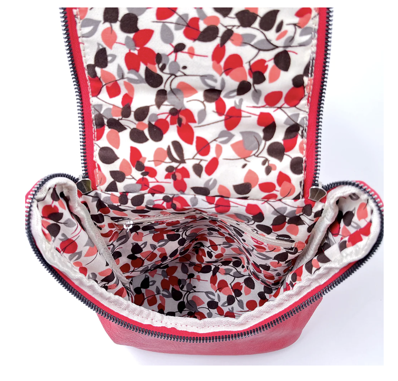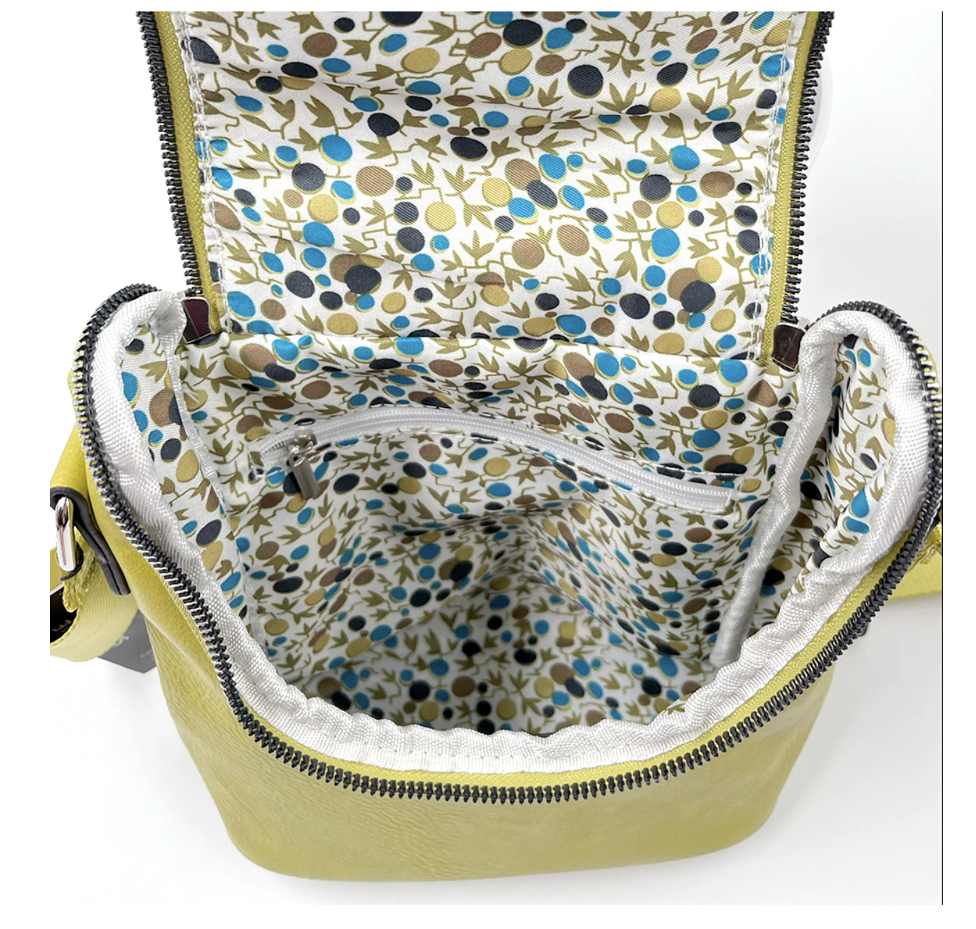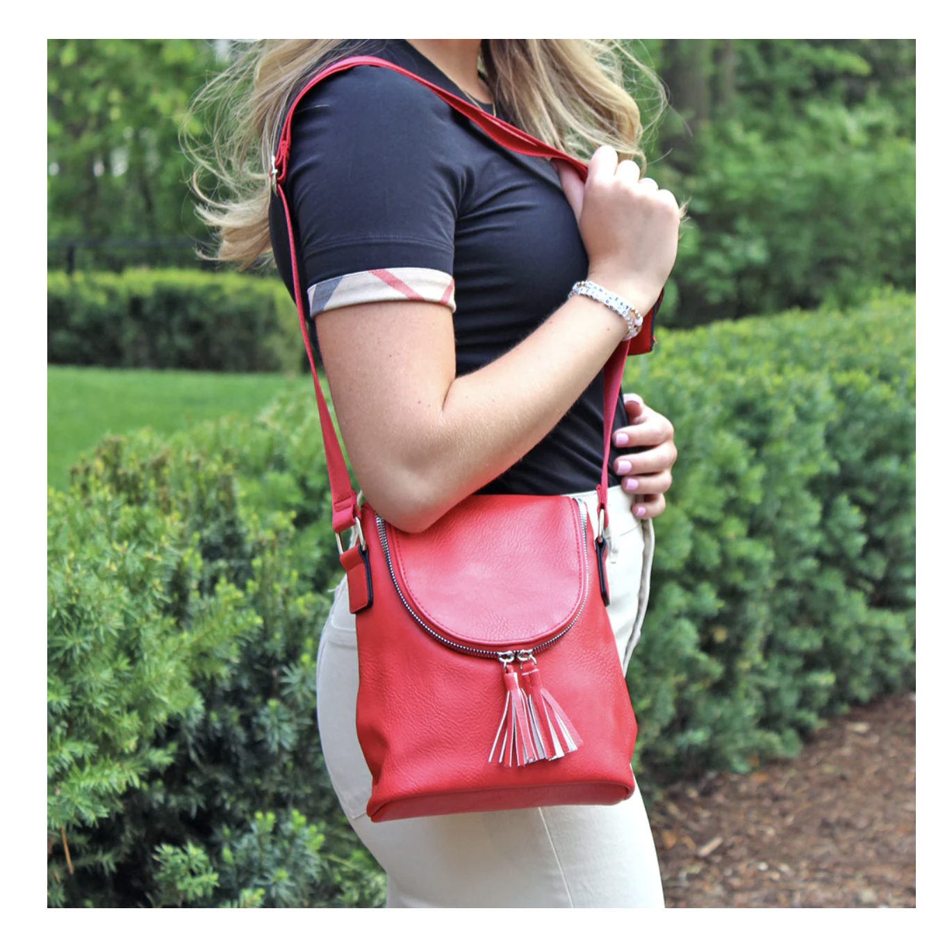 This stylish vegan leather crossbody with a unique front oval zipper opening for wide access. Adjustable nylon strap. Interior zipper pocket, silver hardware, adjustable nylon strap and2 RFID-protected credit card slots.