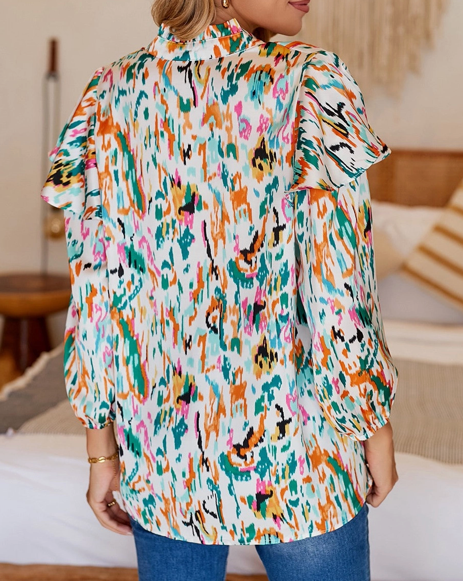 This elegant blouse displays a stunning abstract print that is sure to draw attention. Ruffled trim along the split v neckline and armholes, along with 3/4 length puff sleeves and elastic cuffs, bring a graceful look. It's crafted from lightweight woven fabric, ensuring a comfortable feeling all day long.
