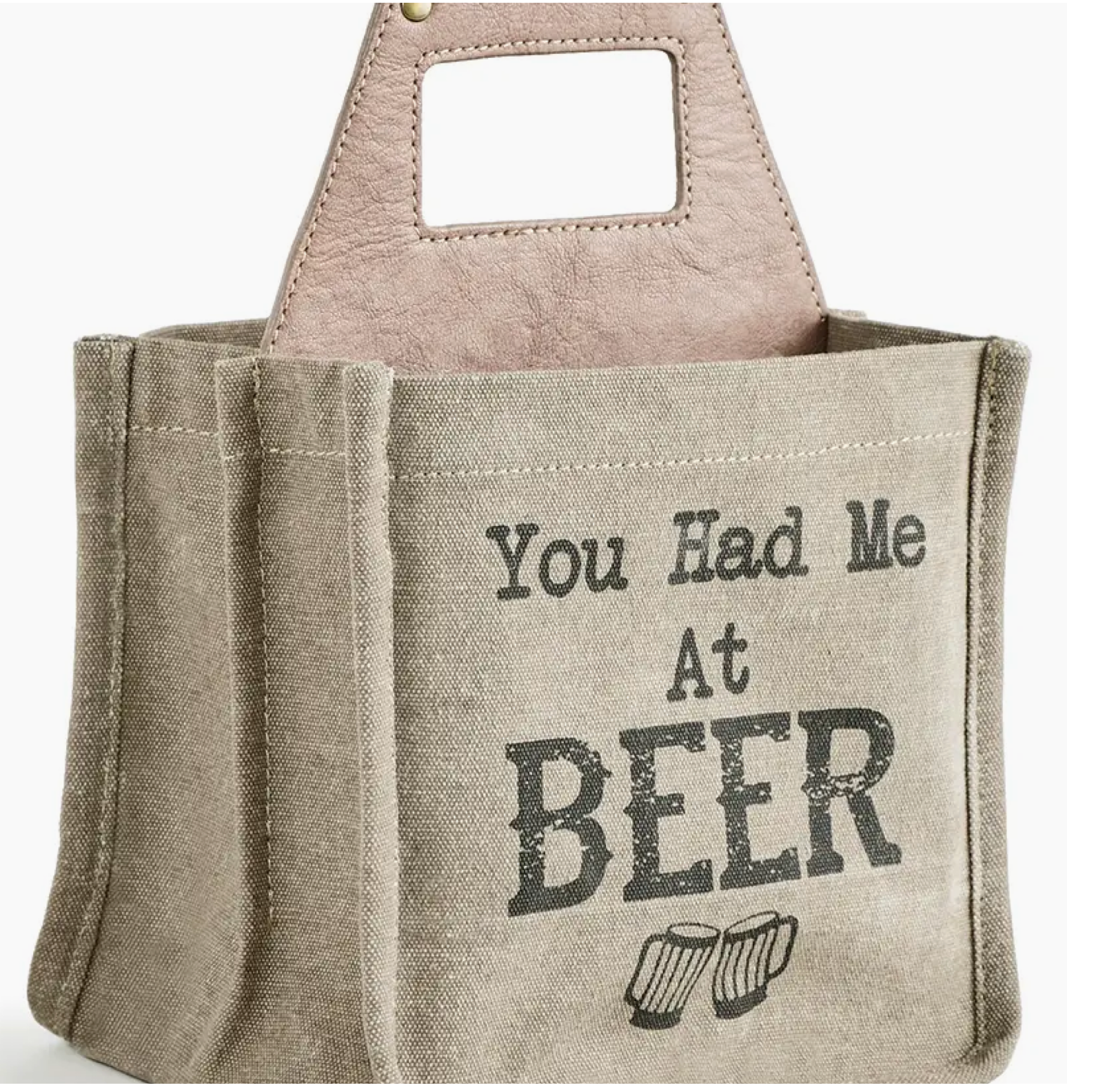 Short Description: Safely and stylishly carry your favorite 6-pack in style to the next gathering, sporting event, or even give it as a gift! The Mona B up-cycled canvas beer caddy is guaranteed to be a favorite for all! Fits standard 12-oz. bottles or cans.
