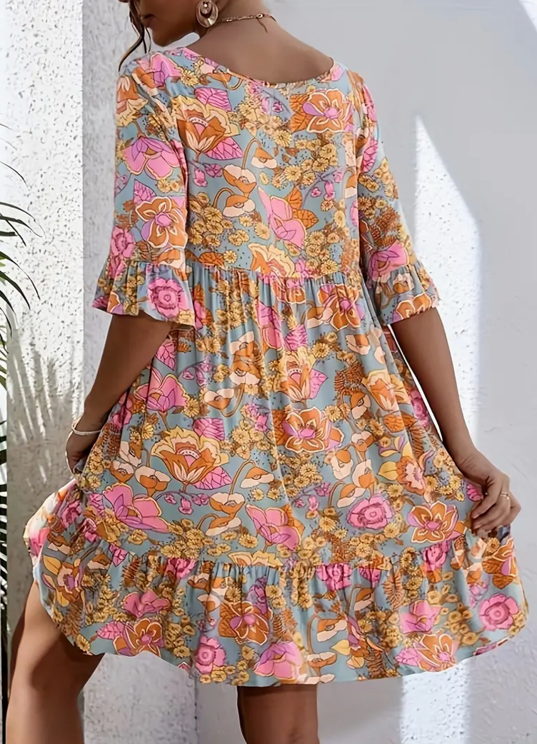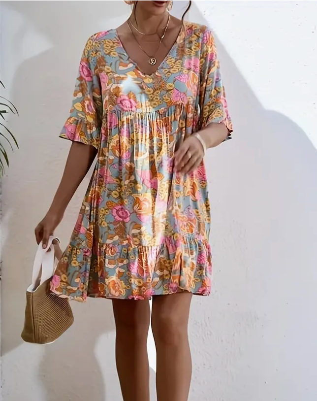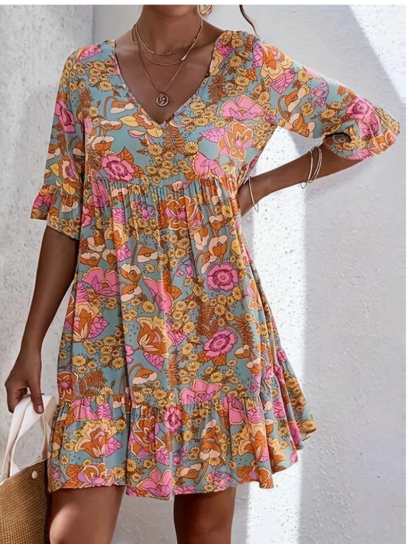 FLORAL PRINT VNECK; PLEATED BOHO STYLE; MID LENGTH SLEEVES; SOFT, MINI SKIRT LENGTH