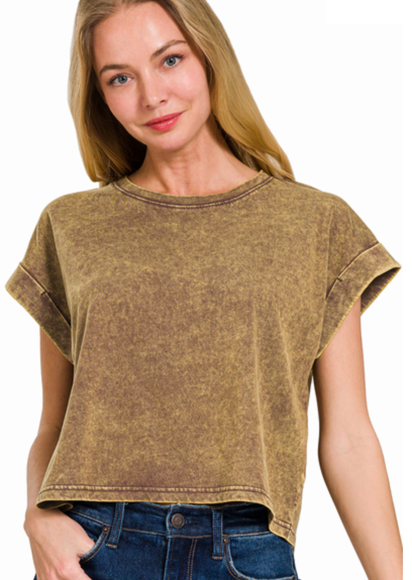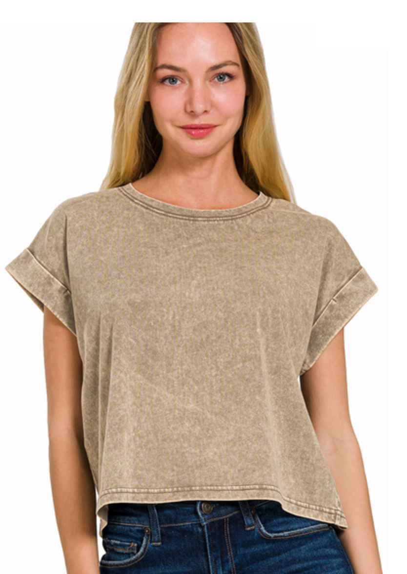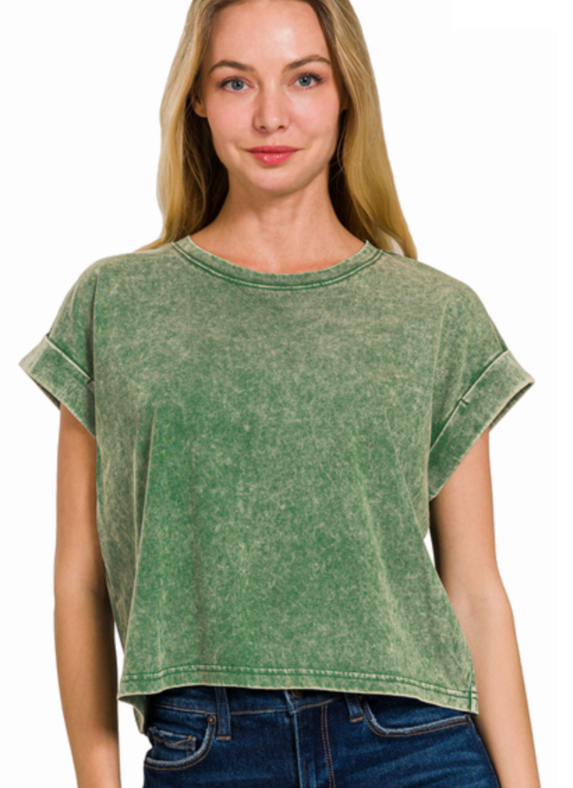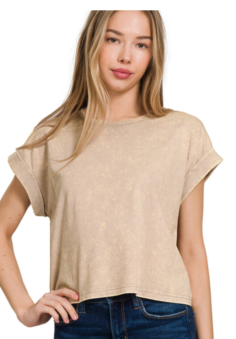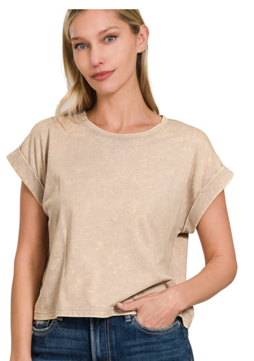WASHED COTTON CUFFED SHORT SLEEVE TOP
