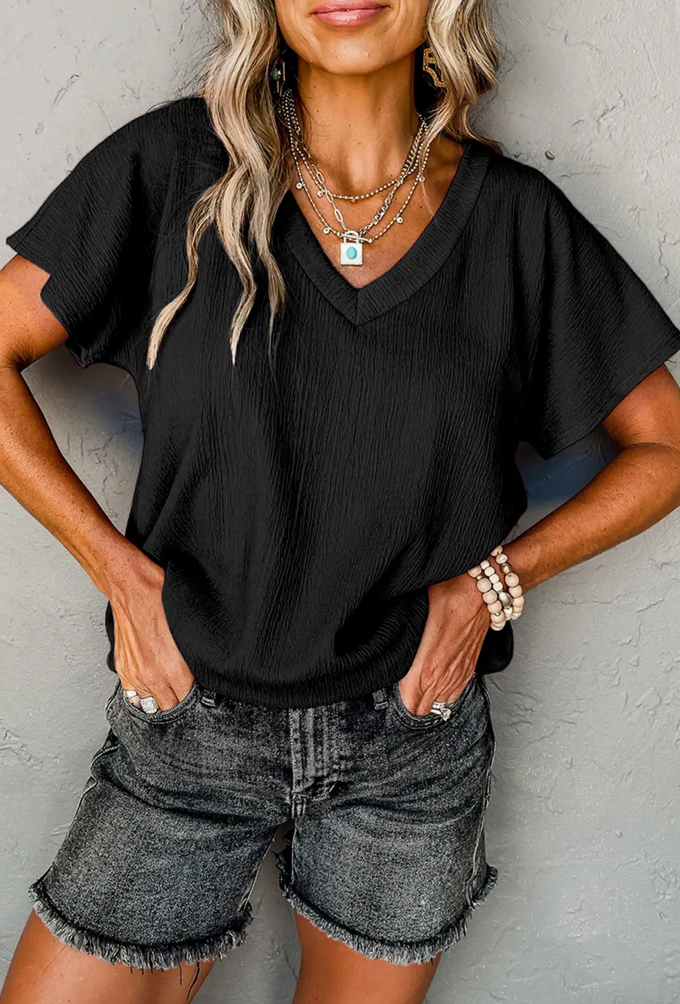 This top features a textured V-neck and a unique bubble hem design. It not only adds a touch of texture to your outfit, but also provides a flattering and stylish fit. Designed for comfort and style, this top is a must-have for any wardrobe.