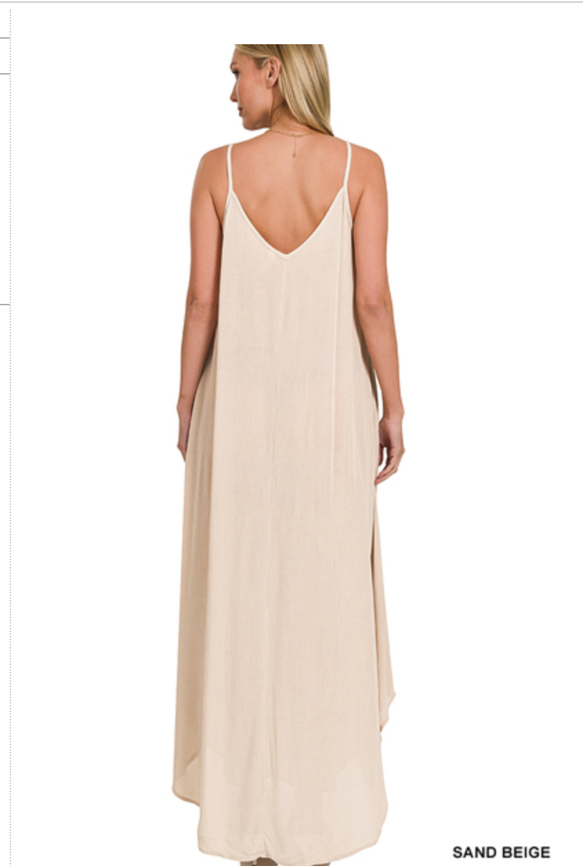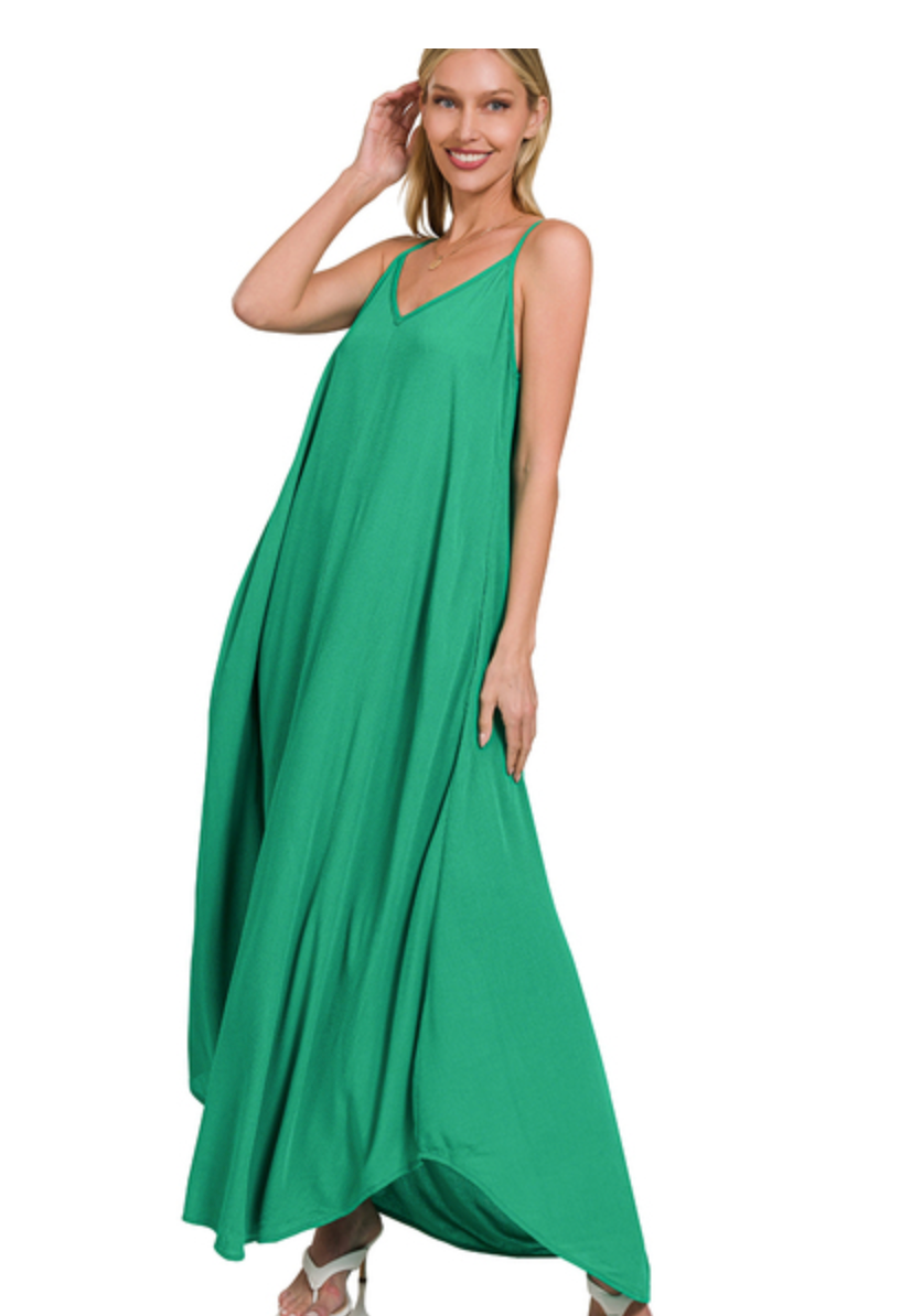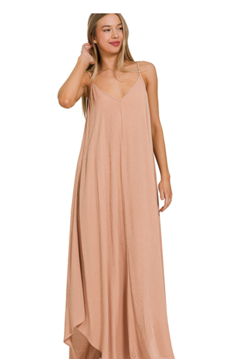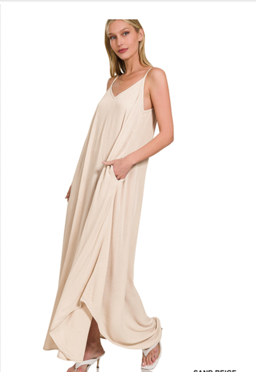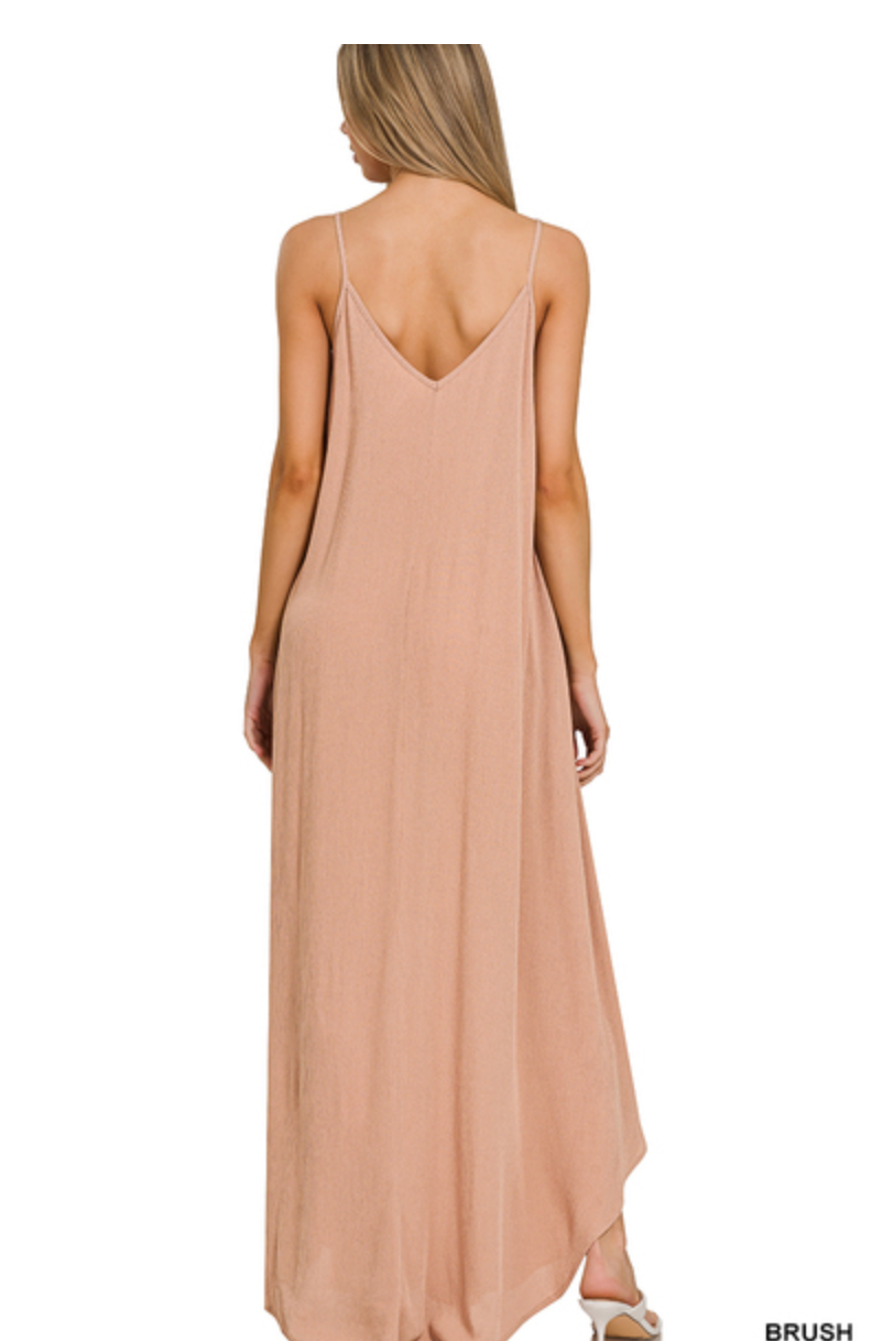 WOVEN CRINKLE V-NECK CAMI MAXI DRESS WITH SIDE POCKETS