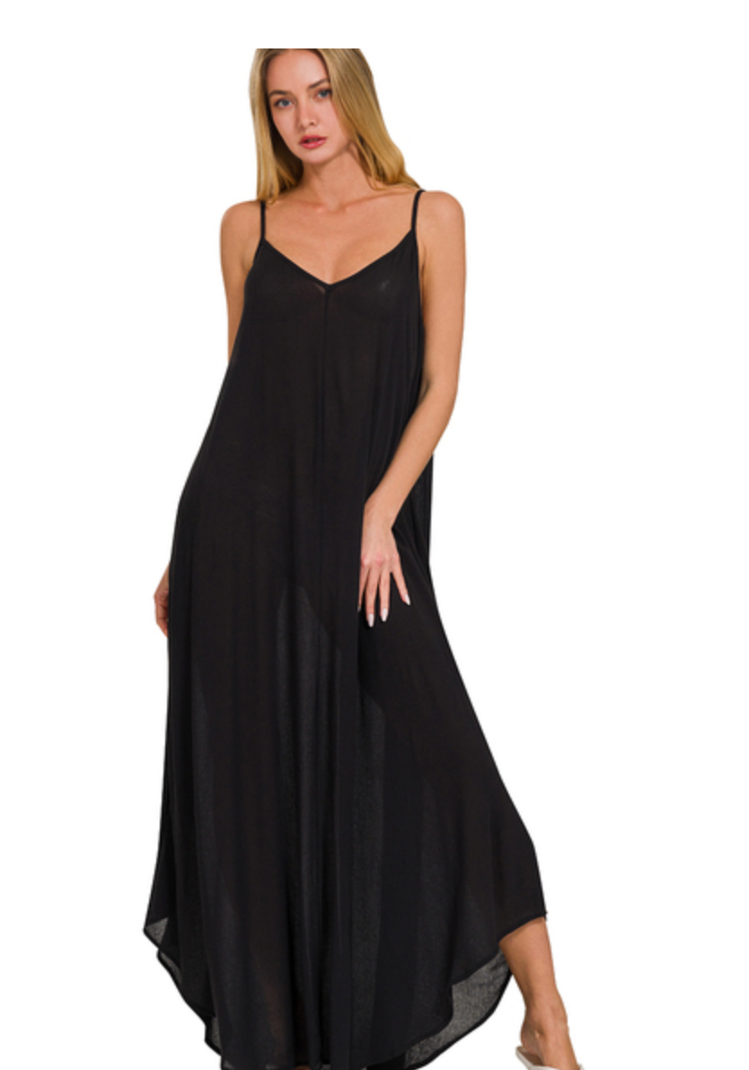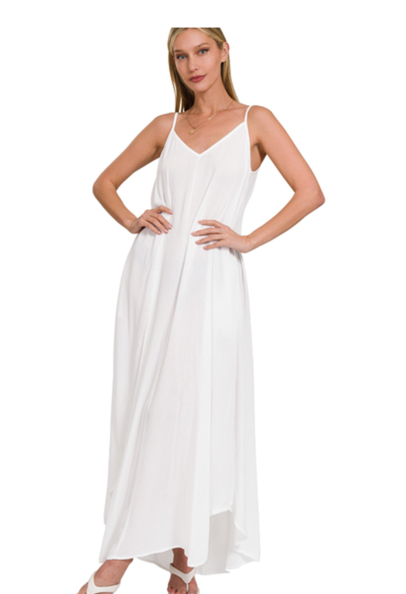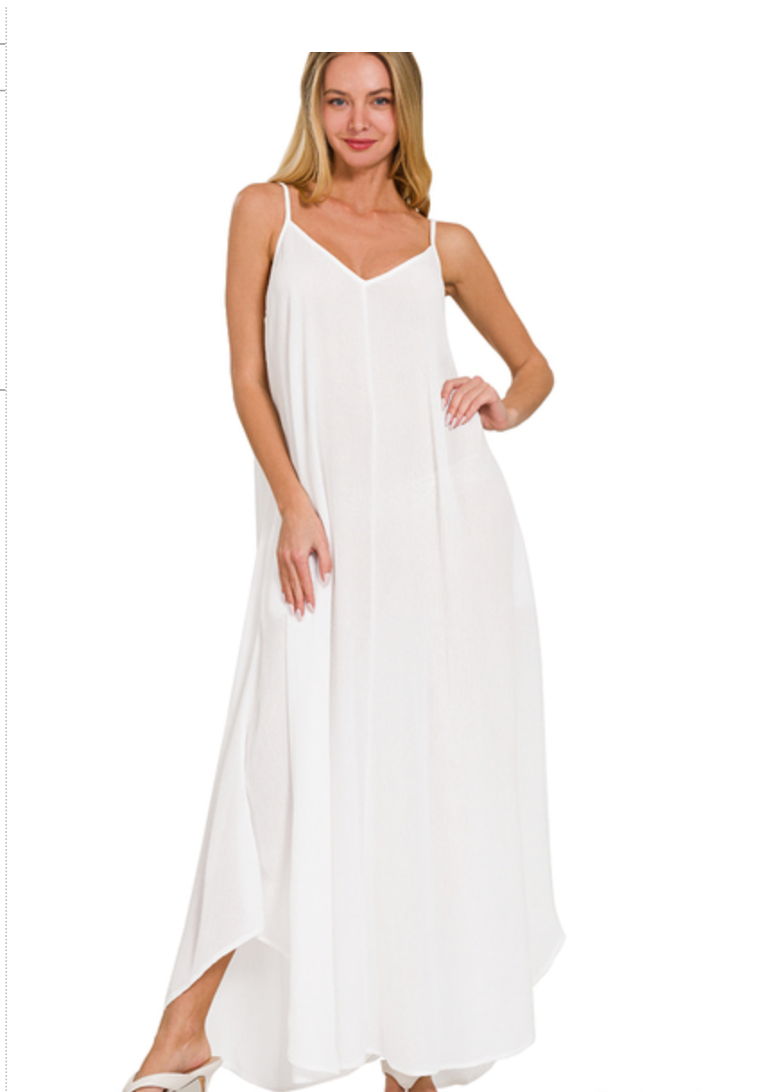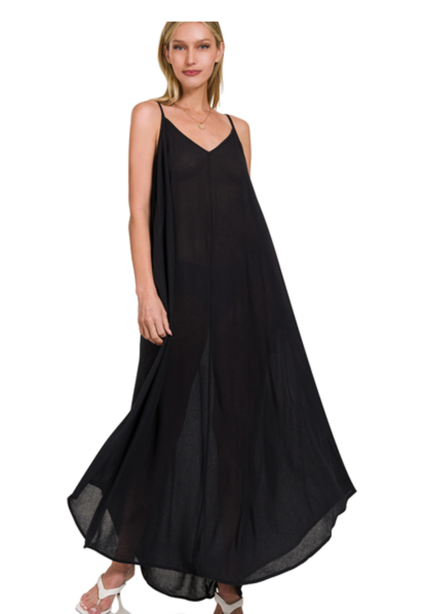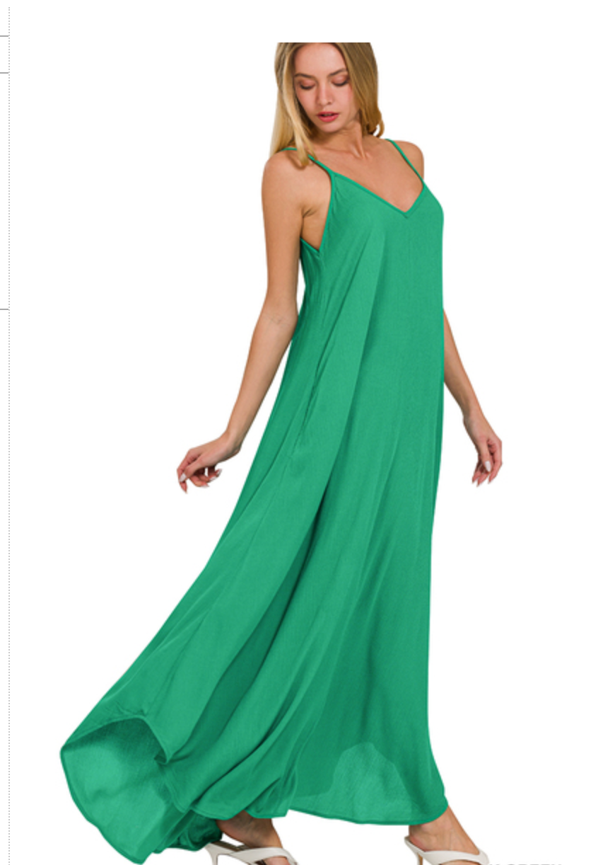 WOVEN CRINKLE V-NECK CAMI MAXI DRESS WITH SIDE POCKETS