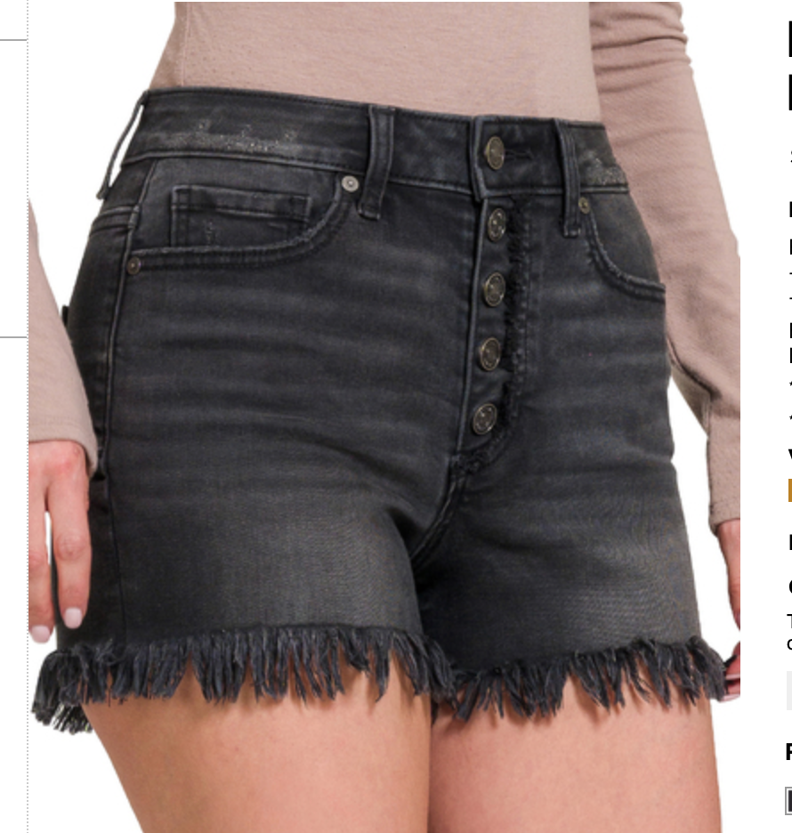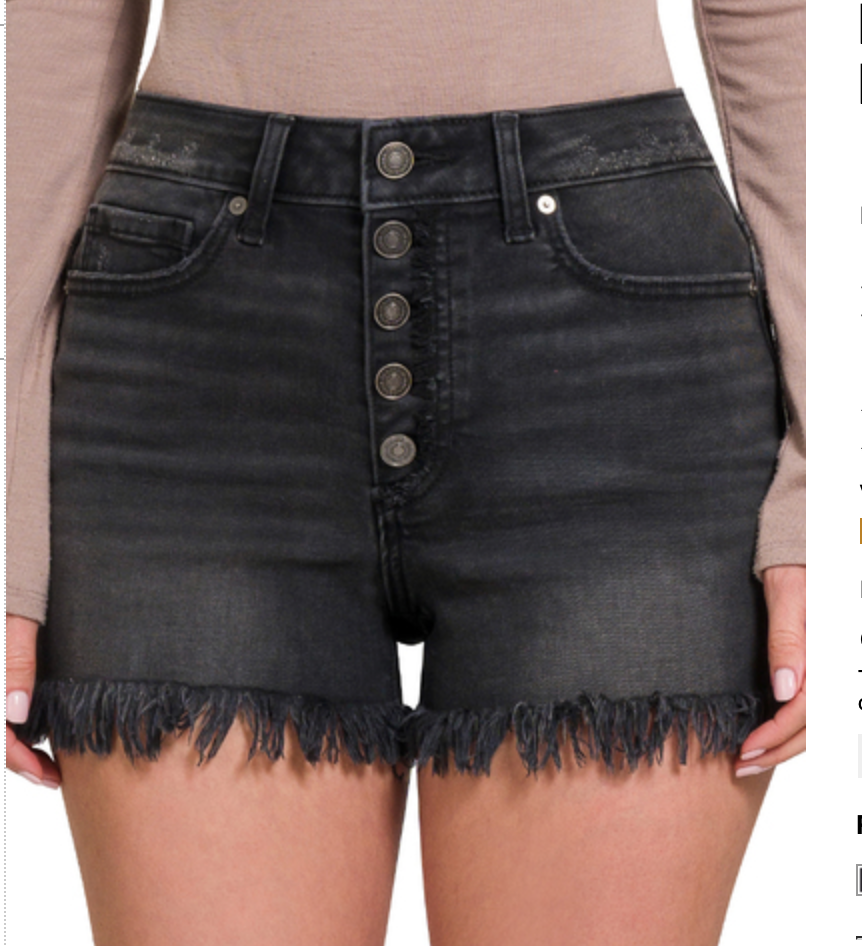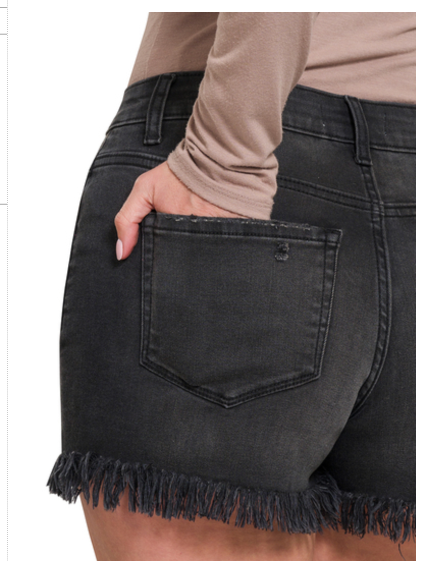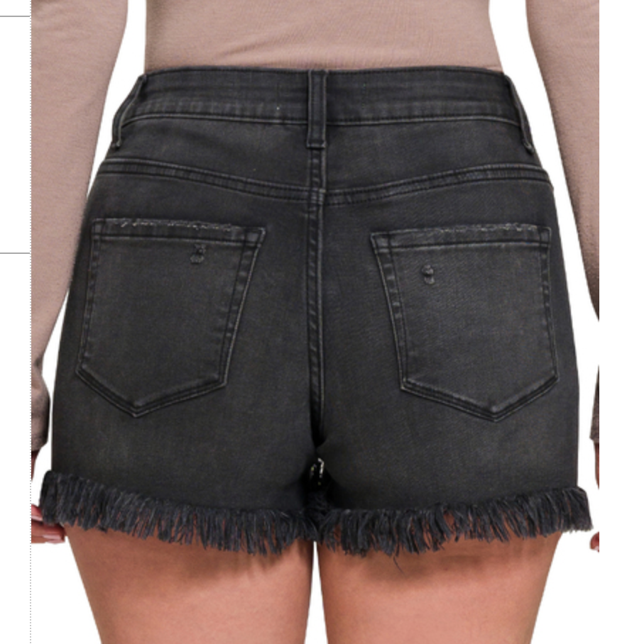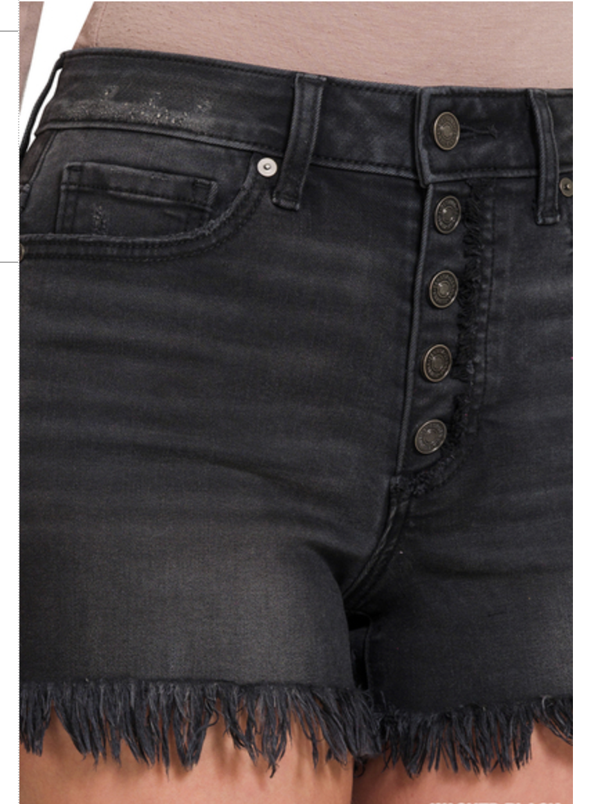FRAYED HEM BUTTON FLY WASHED BLACK SHORTS