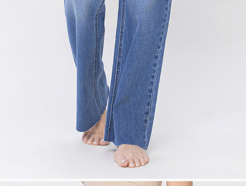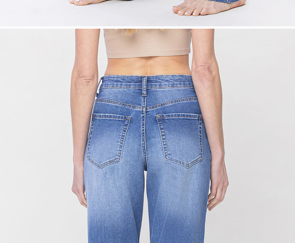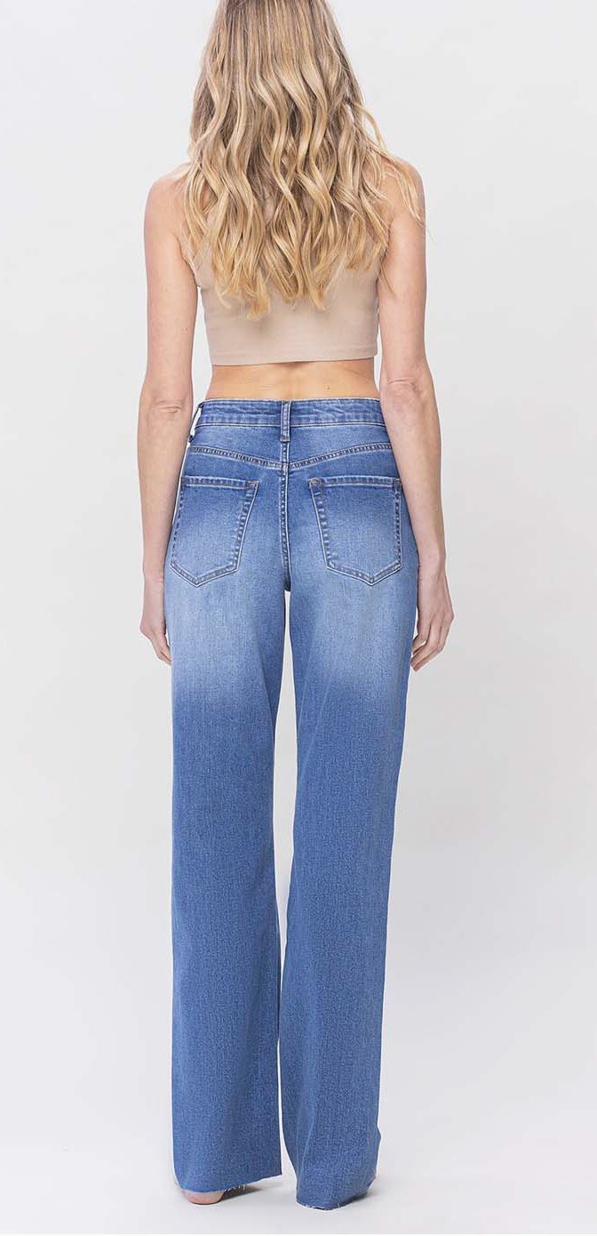 MEDIUM COLOR COMFORT STRETCH DENIM, SUPER HIGH RISE WAIST, CLEAN CUT HEM, FULL LENGTH, 90s DAD JEANS