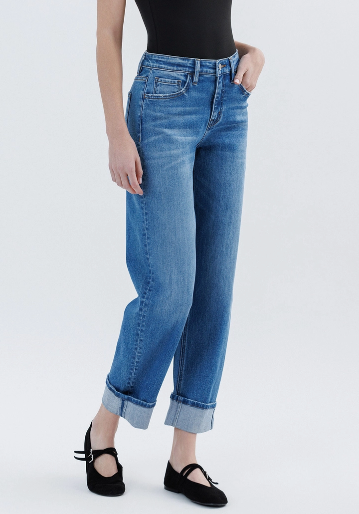 Comfort stretch denim, high rise waist, single cuff hem, cropped length, barrel leg jeans