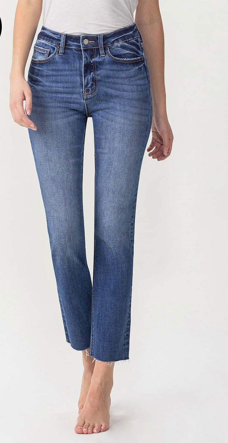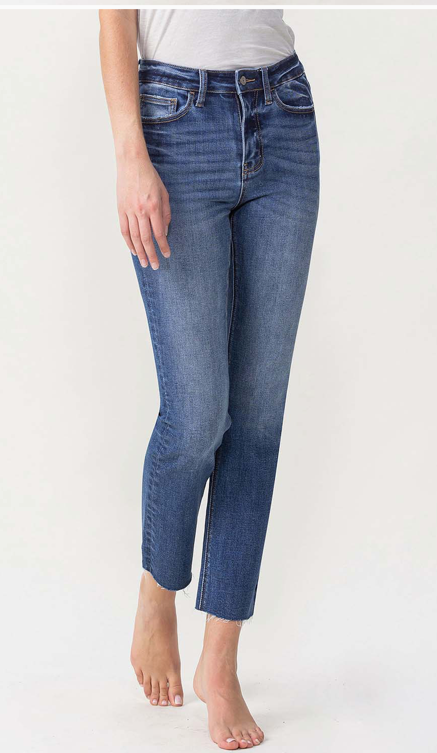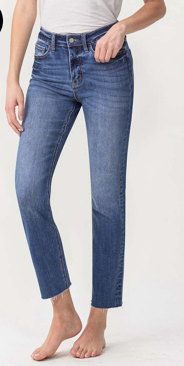 (48)Comfort stretch denim, ankle length, straight fit, raw edge, clean cut hem, super high-waisted and fitted through the hip and thigh 1028234
