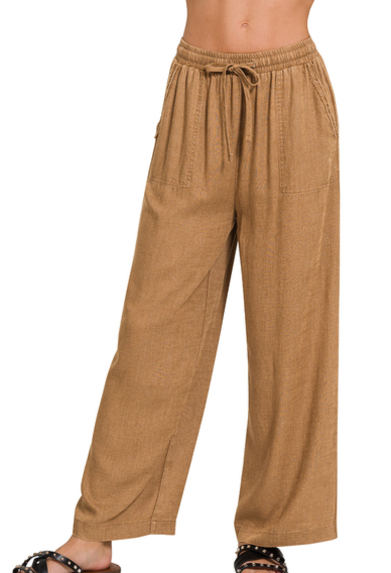 ACID WASH LINEN BLEND ELASTIC BAND WAIST PANTS 7188