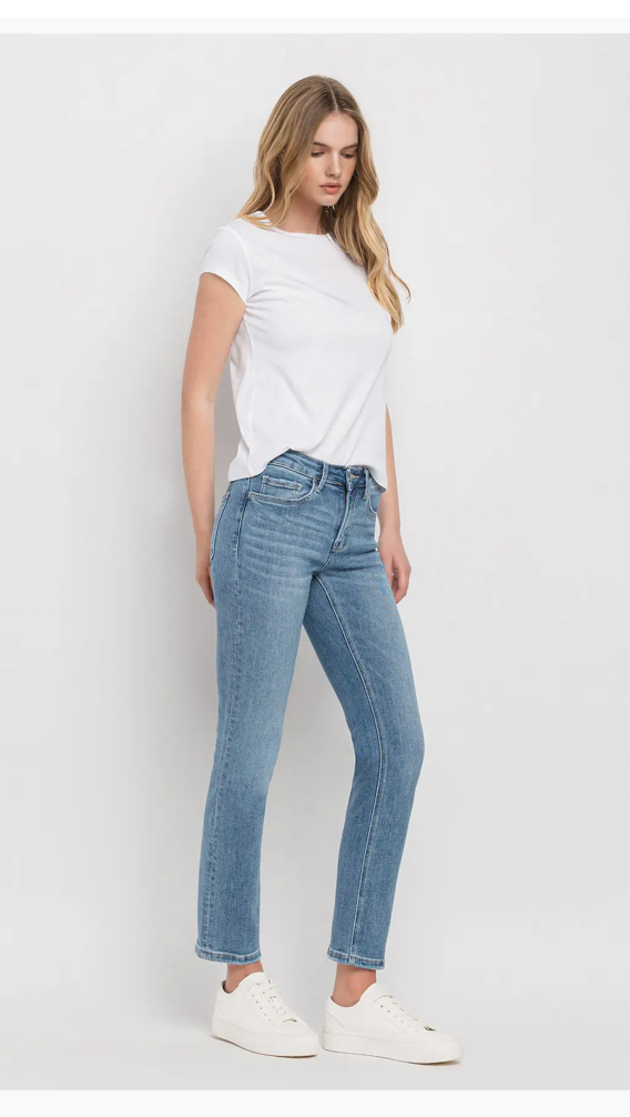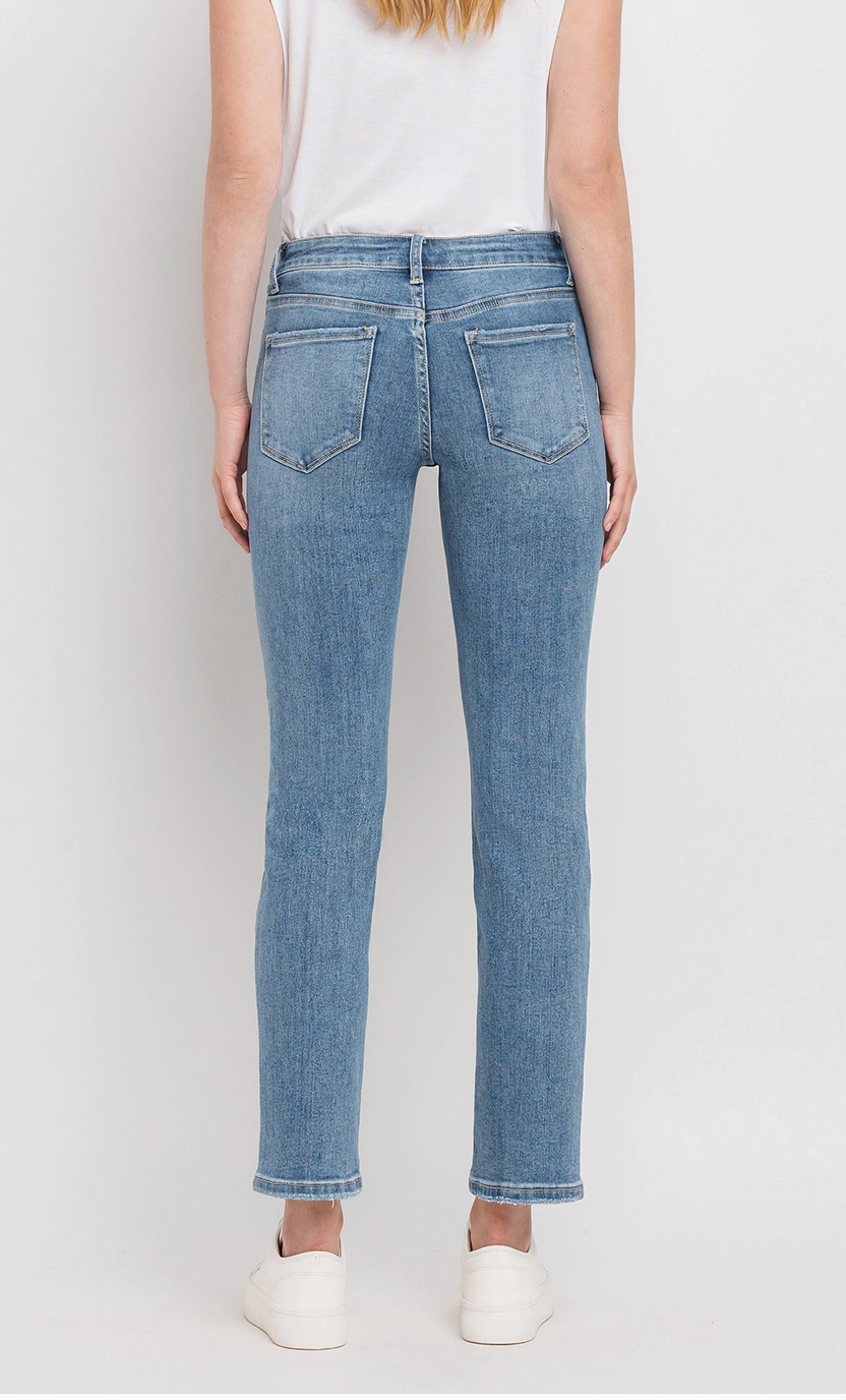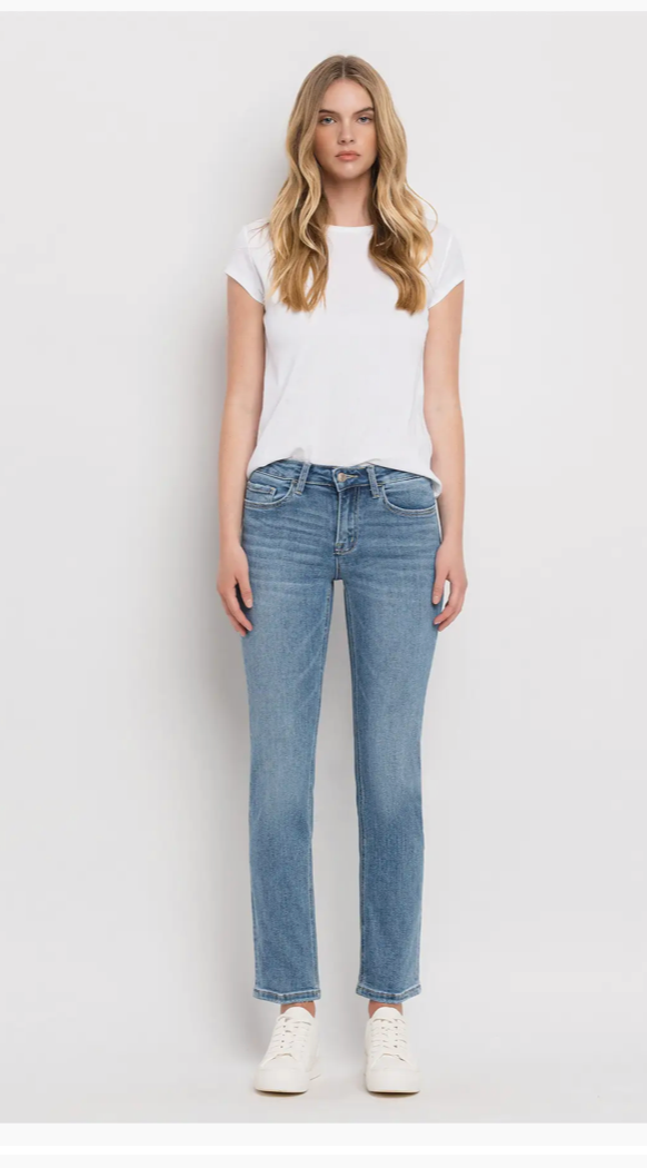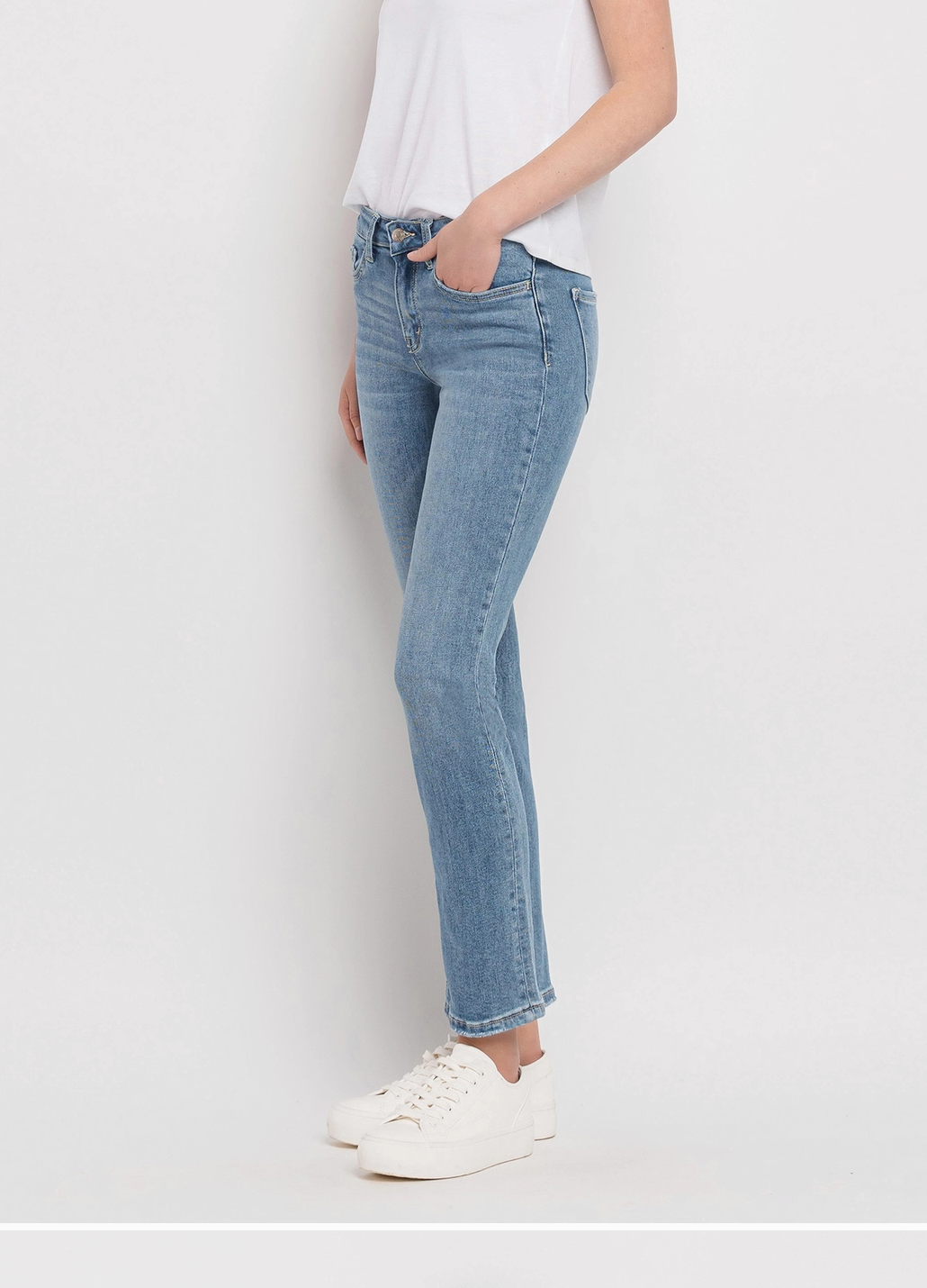 COMFORT STRETCH DENIM, MID RISE WAIST, ANKLE LENGTH, SLIM STRAIGHT JEANS
