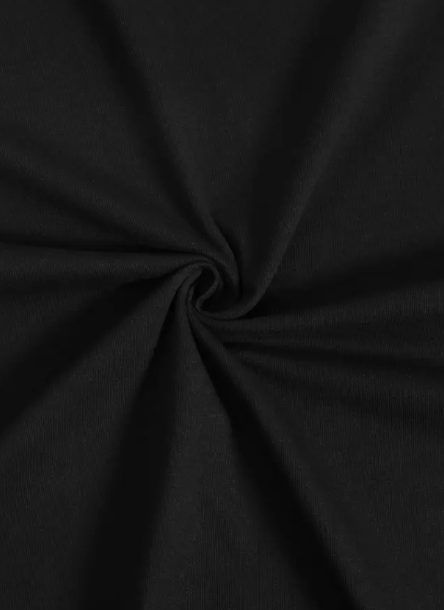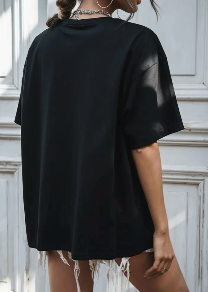 Black Washed Tee with Guitar & Floral Print, Round Neck Short Sleeve