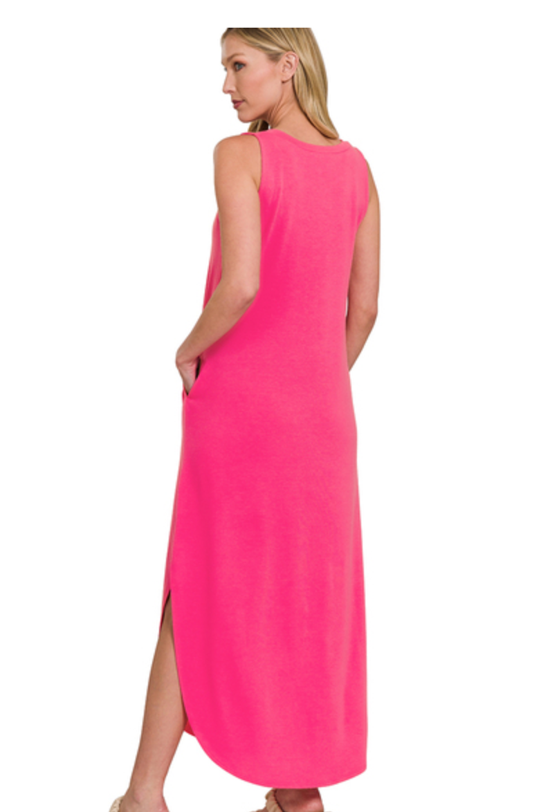 dSLEEVELESS ROUND NECK MAXI DRESS WITH SIDE SLITS AND POCKETS