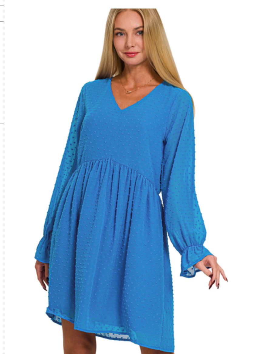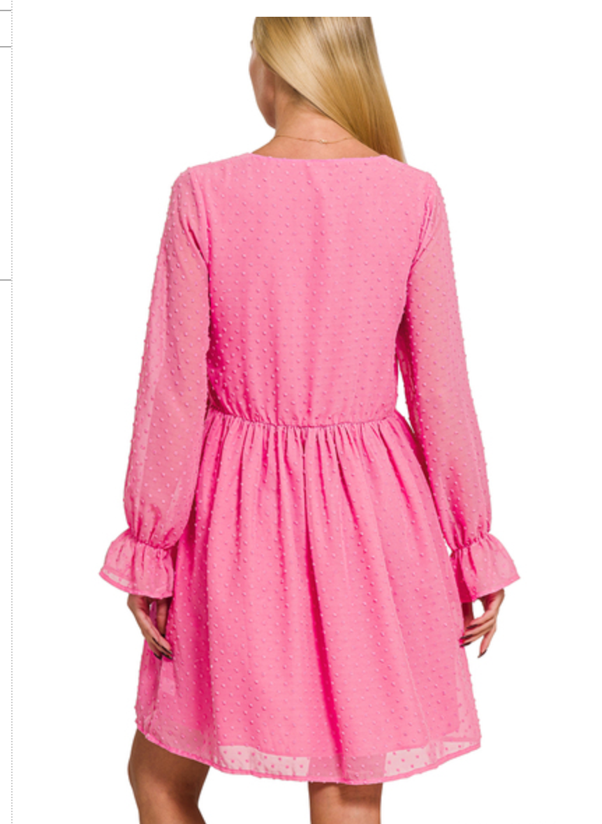 SWISS DOT LONG SLEEVE V-NECK DRESS