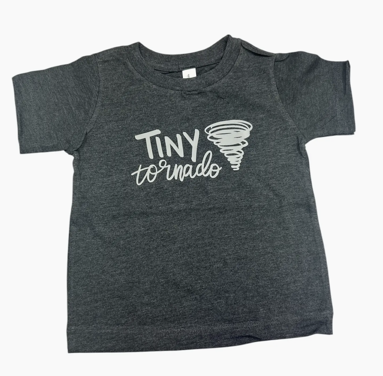 “Tiny Tornado” applied to a heather dark grey Bella + Canvas tee with heat transfer vinyl.