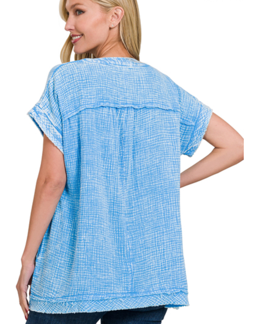 WASHED DOUBLE GAUZE RAW EDGE SHORT SLEEVE V-NECK SHIRT