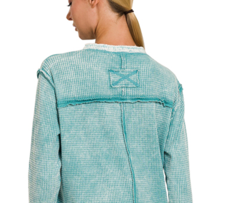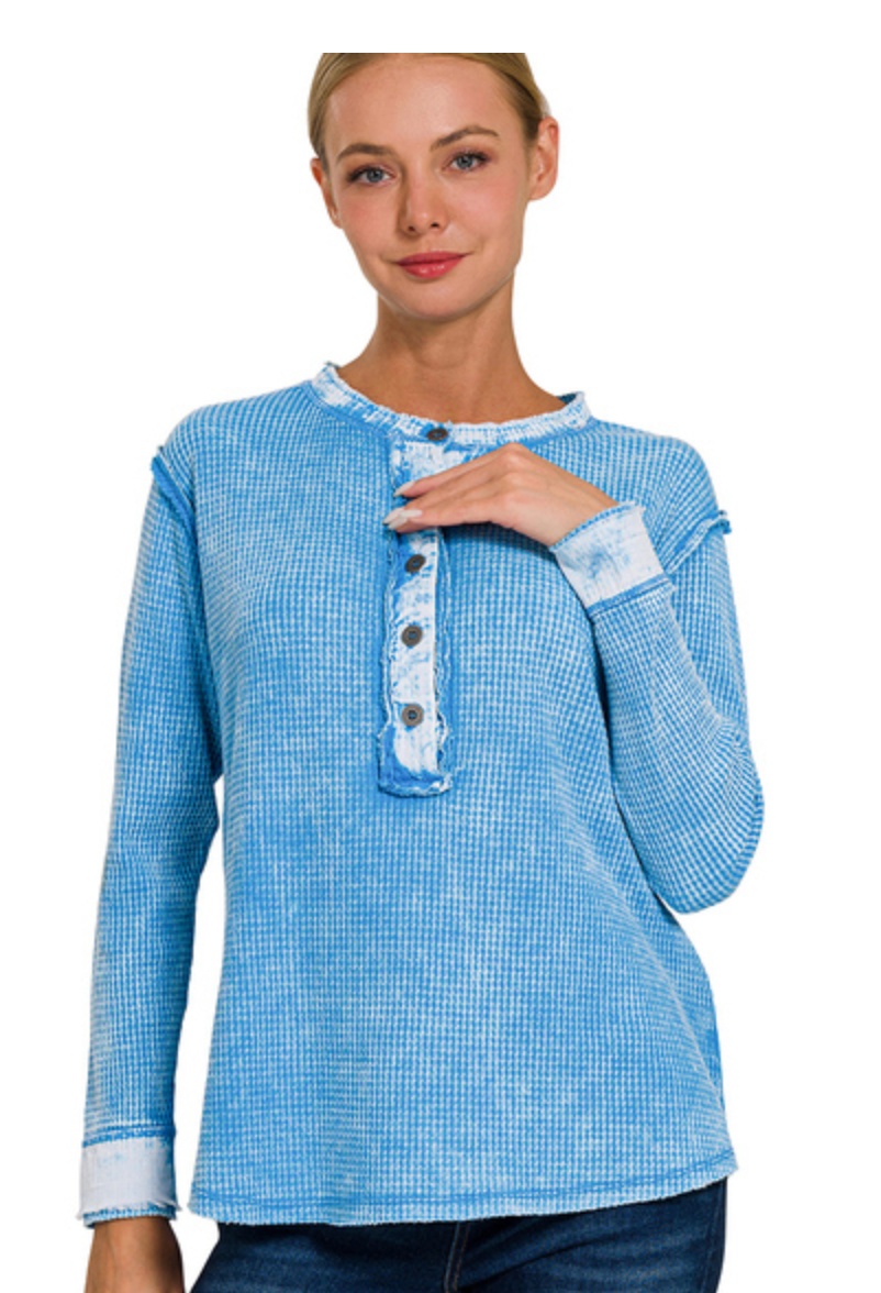 WASHED BABY WAFFLE HENLEY NECKLINE LONG SLEEVE TOP